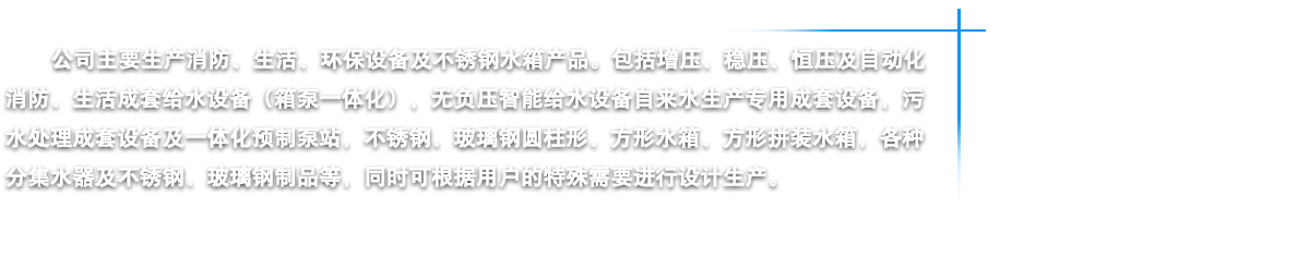 江蘇燁達環(huán)保設(shè)備有限公司坐落在江蘇省鹽城市建湖縣城,東臨黃海之濱,背倚蘇北平原,處于長三角經(jīng)濟一體化和江蘇沿海開發(fā)兩個國家級戰(zhàn)略疊加區(qū)域內(nèi),素有“水鄉(xiāng)明珠”美稱。我公司鑒定走“產(chǎn)、學、研”相結(jié)合的路子,是江蘇省供水設(shè)備行業(yè)的大型企業(yè)。公司以“一流的管理,一流的研發(fā)設(shè)計,一流的質(zhì)量意識,一流的售后服務(wù)”為宗旨,嚴格控制原材料質(zhì)素,講求“品質(zhì)是企業(yè)的生命力”的理念,嚴把質(zhì)量關(guān),從而為客戶提供優(yōu)質(zhì)的供水設(shè)備。公司主要生產(chǎn)消防、生活、環(huán)保設(shè)備及不銹鋼水箱四大類產(chǎn)品。包括增壓、穩(wěn)壓、恒壓及自動化消防、生活成套給水設(shè)備(箱泵一體化),無負壓智能給水設(shè)備自來水生產(chǎn)專用成套設(shè)備,污水處理成套設(shè)備及一體化預制泵站,不銹鋼、玻璃鋼圓柱形、方形水箱、方形拼裝水箱,各種分集水器及不銹鋼、玻璃鋼制品等,同時公司可根據(jù)用戶的特殊需要進行設(shè)計生產(chǎn)。燁達人將以科學的管理、精湛的技術(shù)、可靠的質(zhì)量、優(yōu)良的品質(zhì)向社會各界服務(wù),我們始終坦誠相見,我們當然走在最前面······ |